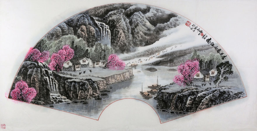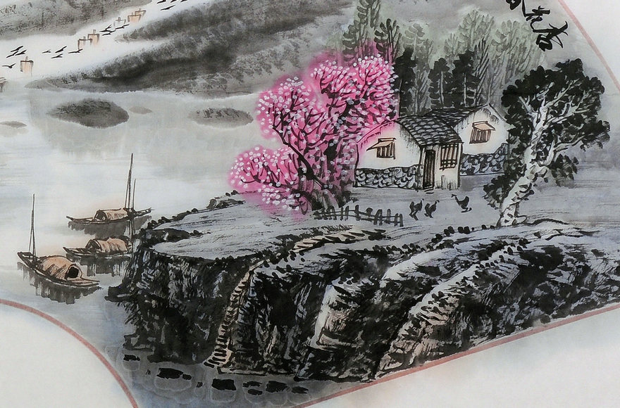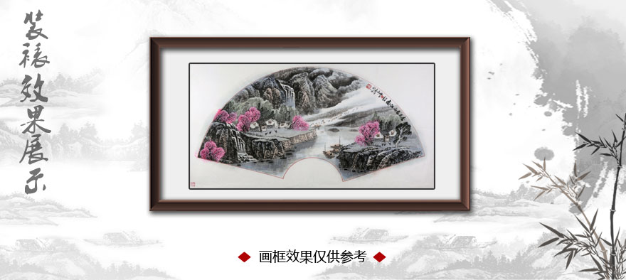 整幅画场景开阔格调淡雅,给人的感觉富有文艺气息,景物虚实结合,山石树木房屋建筑等都是实写,而河流云雾都是虚写或留白来展示,虚实结合展现了高超的绘画技巧。