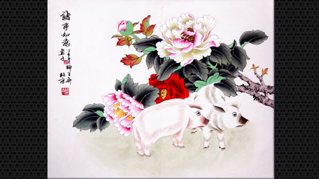 作品以猪为主体,采用对角线式构图,添加牡丹丰富画面寓意吉祥,体现了丰富的生活趣味。蹄与题谐音,所以猪常被认为寓意步步高升、金榜题名。