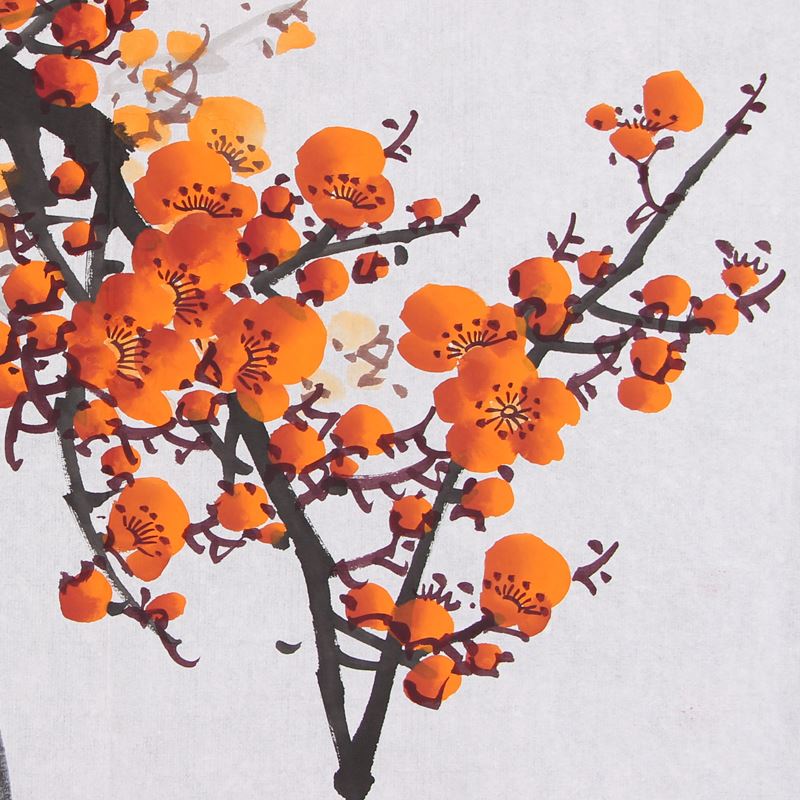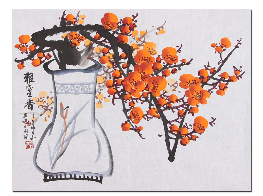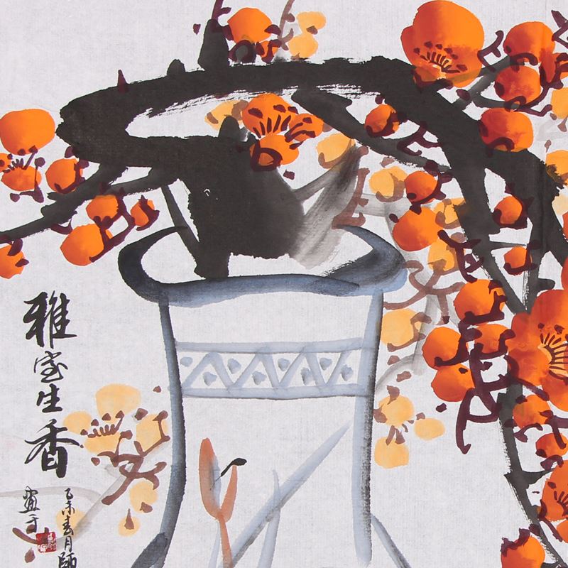 这幅画中的梅花,似是刚被折取下来,插在瓶里,依旧开的非常旺盛,骄傲又夺目。花朵后面是画家晕染的淡淡粉色,与地上散落的花瓣相呼应,增添了意境,也营造了更为雅致的氛围。