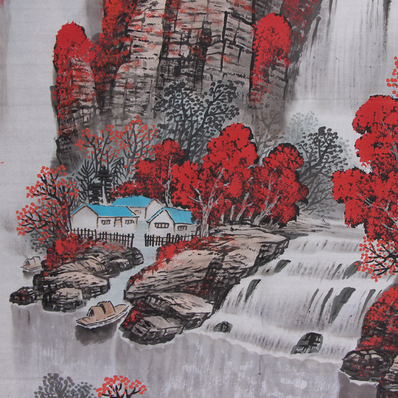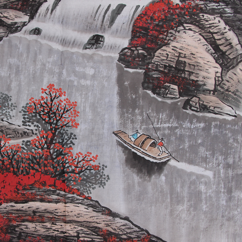 作品描绘了开阔大气的自然山水景色,高山雄伟装绵延万里,灰色的山石正是自然界中最常见的山之色彩,而山顶红色的植被众多,有万山红遍层林尽染的美感,山间云雾弥漫意境优美!