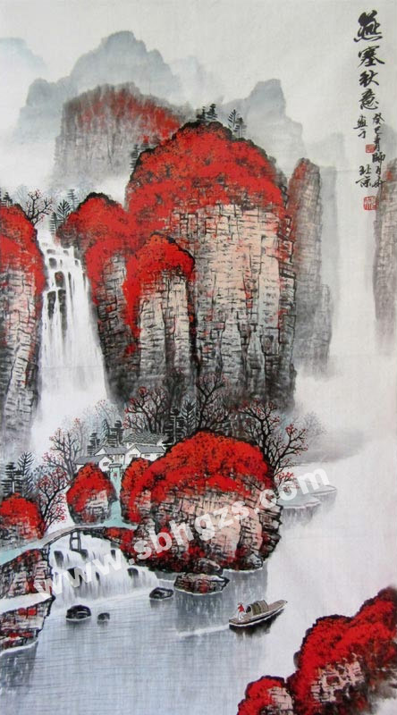 作品通过平视的角度描绘了整幅画作品,整幅画描绘十分细致,山脉厚重雄伟上面植被茂盛,瀑布如练飞流而下,河流缓缓流入,岸上多茂盛植被,红色和青色相间展现了美丽的山水景色!