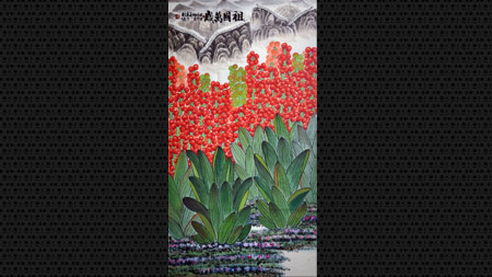 画中山色苍茫凝实,百花盛开,以虚实结合神采之妙,将绵延的长城刻画的有血有肉,其山取盘桓向上高远之势,其花造平静娇艳之态,其树画翠绿浓情之意。