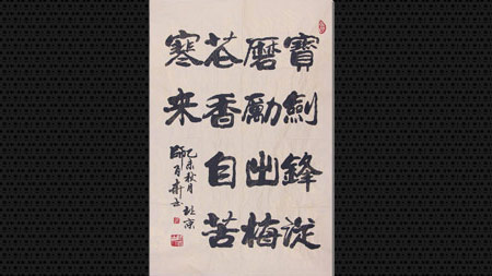 书法<宝剑锋从磨砺出,梅花香自苦寒来>